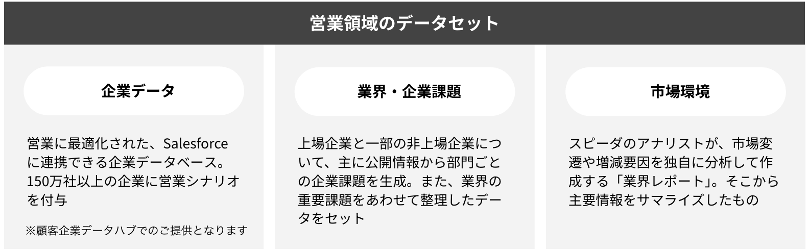 Speedaが保有する経済情報の中から、営業活動にすぐ使えるデータセットをご提供。