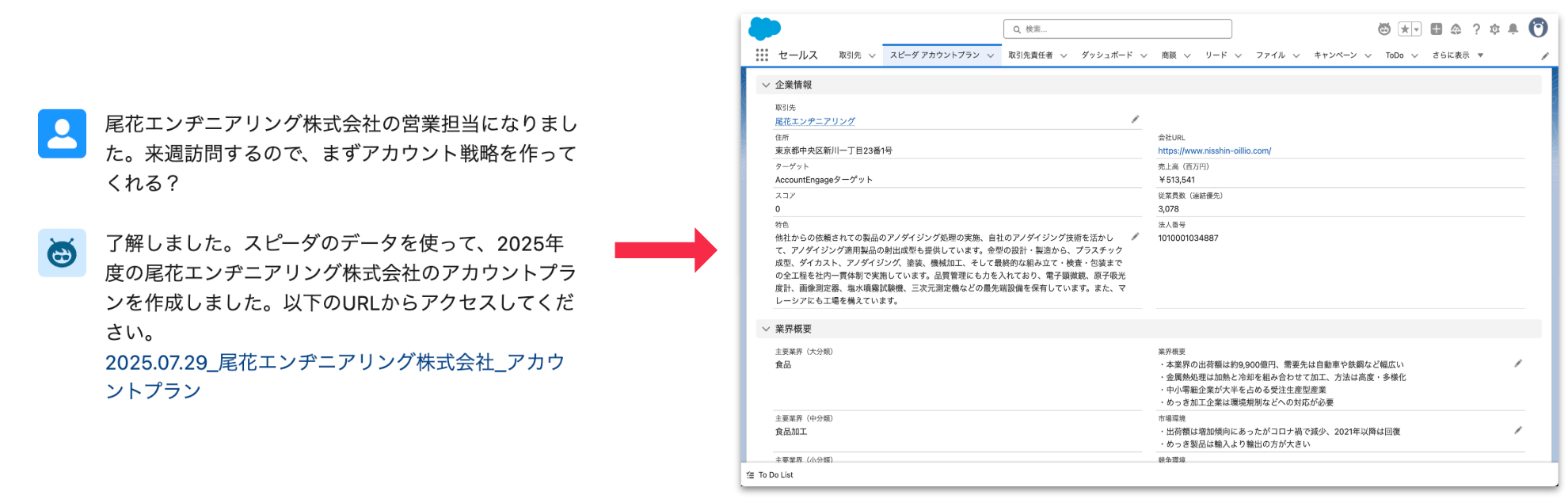 Speedaのデータを元にして、その企業の「アカウントプラン」のベースを自動作成。作成したアカウントプランはSalesforceの中に蓄積され、過去からの変更経緯や、最新のアプローチ状況を共有可能。
