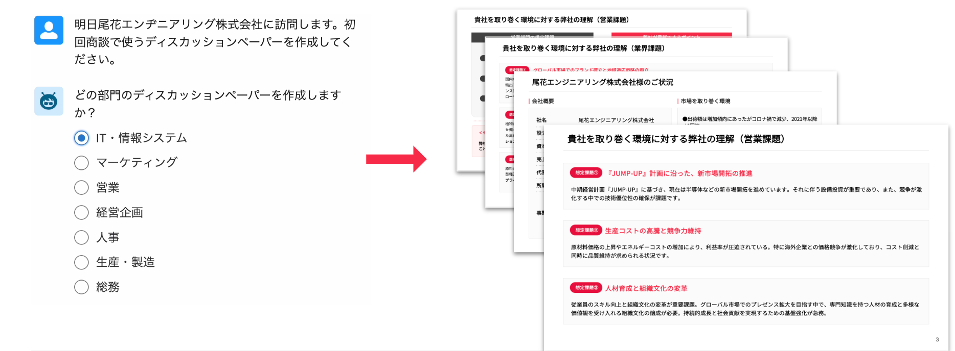 Speeda エージェントに依頼すれば、商談に使う資料をボタン1クリックで作成。誰もが、企業が保有している「課題」をベースに標準化された営業資料を簡単に作成できます。