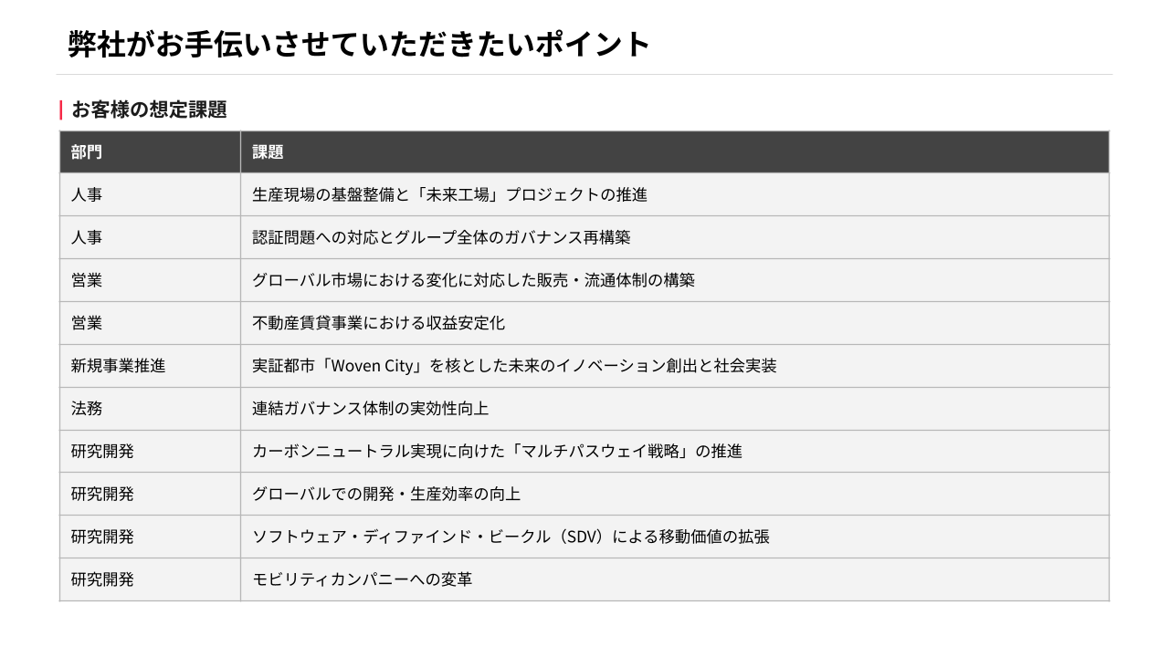 従来、エージェントとの会話中に指定した「指定部門の企業課題」を資料として出力していました。お客様より「出力された営業部門の課題にはなかったが、他部門の課題で資料に使えそうなものがあったので、一覧で課題を見たい」というお声をいただき、このたび該当企業の企業課題を一覧にしたスライドを追加しました。※企業課題の出力対象は上場企業のみとなります