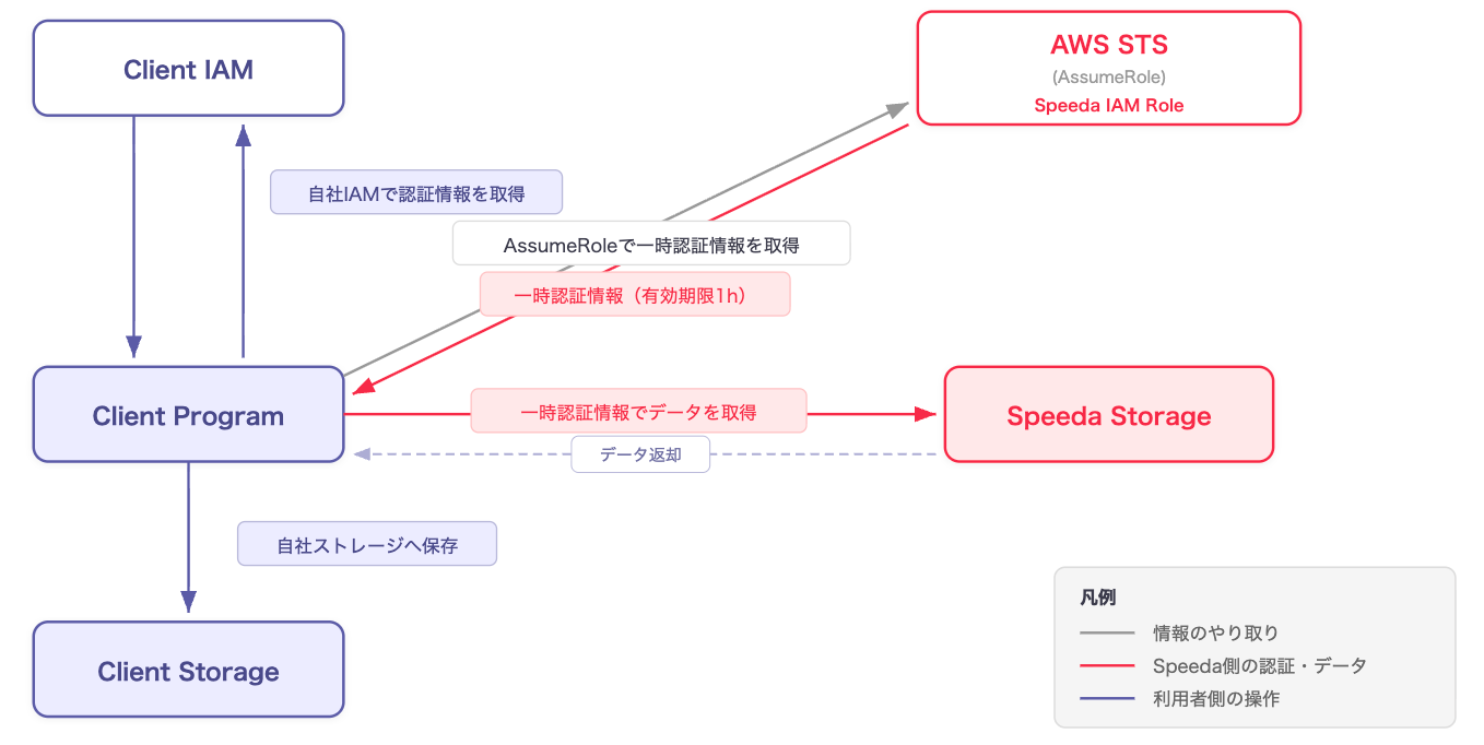 クラウドストレージ連携は、Speedaが提供するデータをクラウドストレージ(Amazon S3)から取得するための連携方法です。データの取得には認証情報が必要です。認証情報の要求に応じて一時的な認証情報を発行しますので、その認証情報を使用してデータを取得してください。