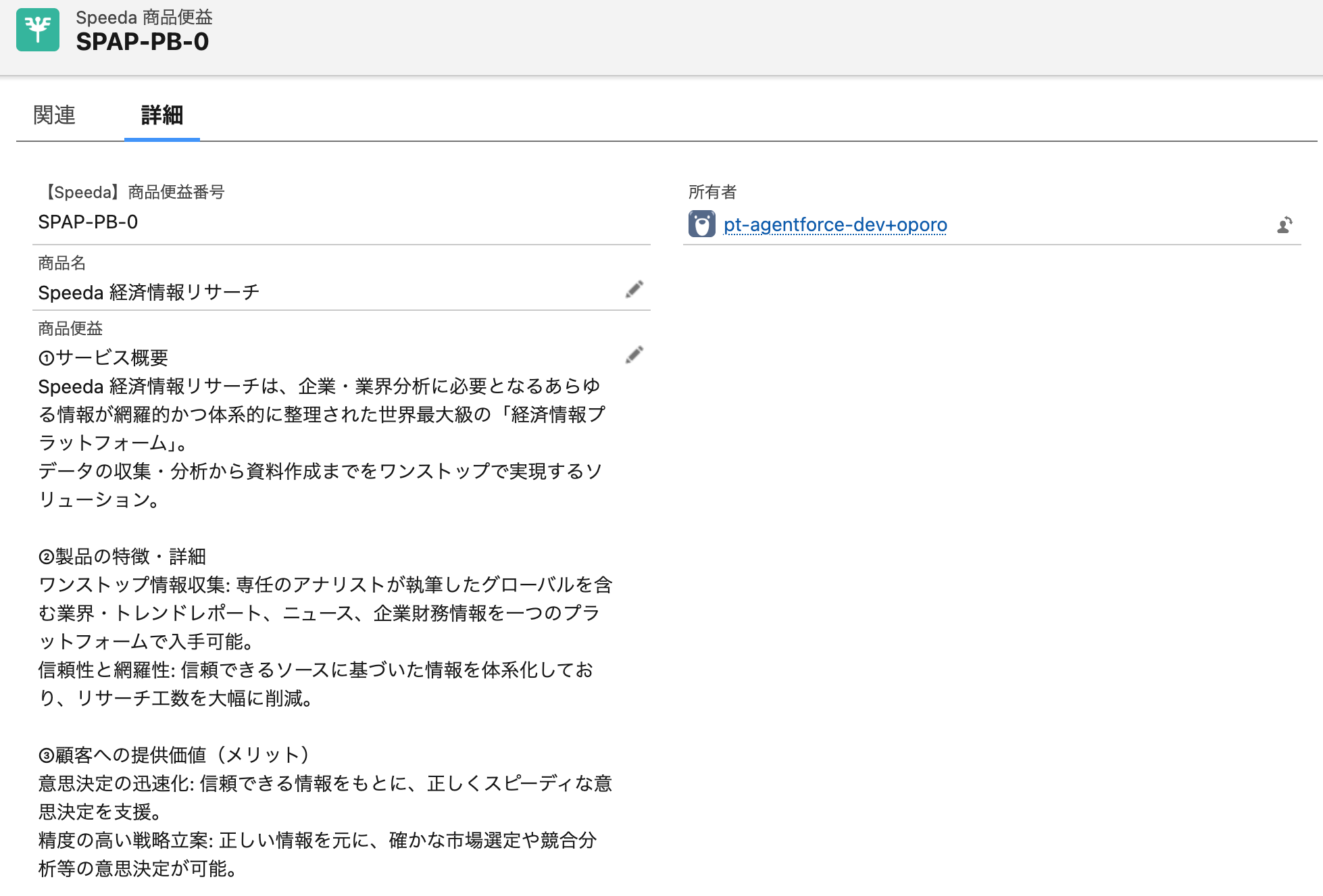 Speeda アカウントプランの仮説やディスカッションポイントは、ここで登録された商品便益の内容をもとにAgentforceのLLMがSpeedaのデータをかけ合わせたアウトプットを作成します。