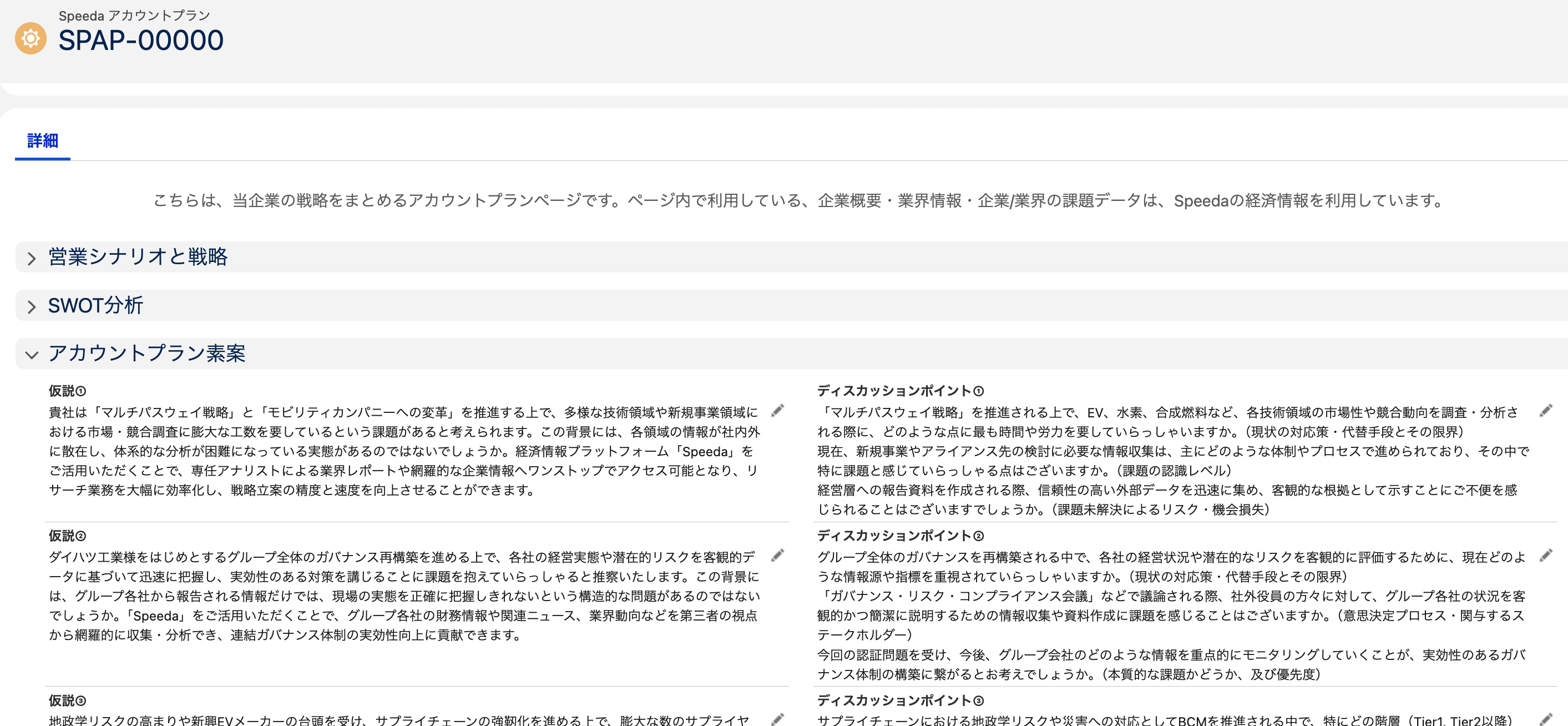 Speeda AI Agent for Salesforce v1.2以降でSpeeda アカウントプランに仮説やディスカッションポイントを表示させるにはSpeeda 商品便益に自社商品の商品便益を登録する必要があります。