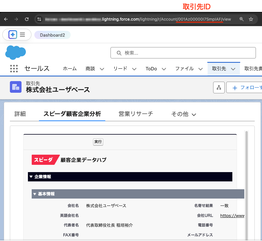 Salesforceに登録されている取引先名と完全に一致する形で入力、または、上記の方法で取得した取引先IDを直接入力してください。