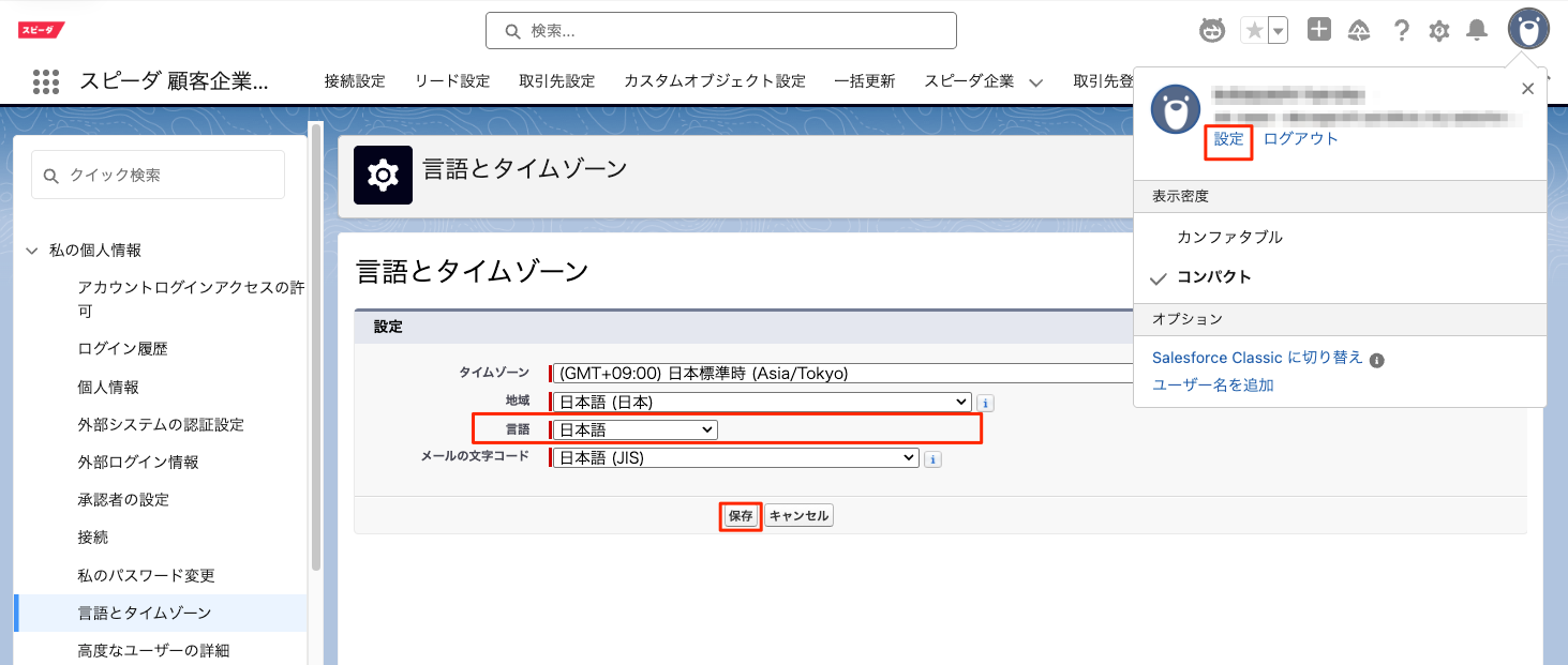 Salesforce>右上ユーザー名>設定>言語とタイムゾーン> 言語を「日本語」に設定する
